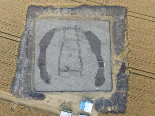 The burial mound has long since been ploughed flat, but its footprint can still be seen: two huge banana-shaped ditches flanking the outline of a trapezoidal timber structure that was once covered with earth. This building measures 19.2m long, and is 10.2m wide at the front, tapering to 6m at the back. It was constructed using a combination of posts and beams, and has a floor plan similar to early Neolithic houses excavated elsewhere; originally it may have been a roofed timber hall. A break halfway along its front indicates the entrance way.