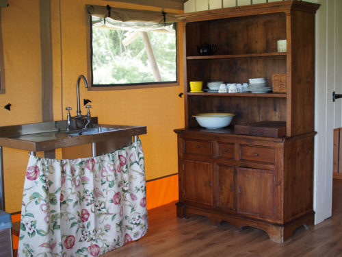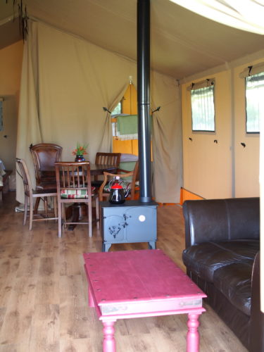Each Lodge Tent has a verandah for those lazy summer evenings and sleeps up to 6 people. They have a fully equipped kitchen with log burning stove, BBQ, two single beds and two double/king size beds, dining tables and chairs, sofa as well as an en-suite bathroom with rain shower.