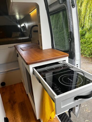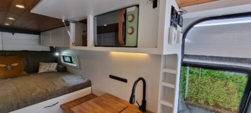 You can also hire their luxury campervan which they kitted out themselves – this is available all year round. They now have this fantastic tiny home on wheels running brilliantly on solar (sadly still needing diesel to drive). It sleeps 4 and has 4 belted seats, table, beautiful wooden kitchen, shower, toilet, 2 single beds and a super king not forgetting a garage with integrated bike storage. Roof rack for surfboards and kayaks, plenty of storage and room for the dog!