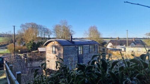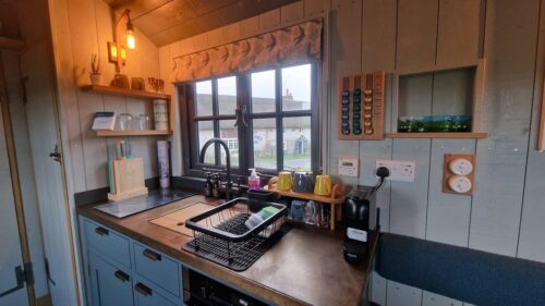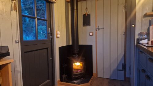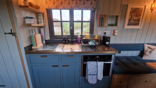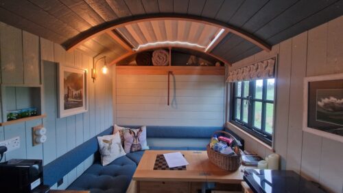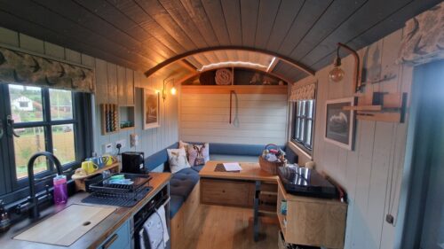 The dining area is cleverly designed with ample storage underneath the seating and features a table that pulls out, revealing a built-in chess board for leisurely afternoons. The thoughtful design continues with a bed that gracefully descends from above the dining area, providing space during the day and a cosy haven at night and a luxury en-suite shower room. Stay connected with Wi-Fi, set the mood with a record player and a selection of music, or unwind with a good book after a day of exploration with the wood burner burning away in the background.