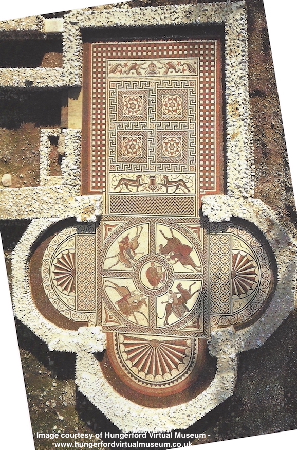 The Roman villa was initially built in about 60AD near the site of a Roman guard post covering a crossing of the River Kennet. Successively rebuilt and enlarged over the next two centuries, in its heyday it boasted 60 rooms, two thermal baths and a number of mosaic floors and hypocausts. The magnificent surviving mosaic floor was built in the mid 4th century. Its central feature depicts Orpheus, god of the underworld and musician to Apollo. It is thought that this was a homage to a religious cult associated with Apollo and Bacchus which flourished at that time. The quality of the mosaic design and the rarity of its overall configuration, with what would have been three semi-circular apses at one end, make it one of the outstanding Roman mosaics in Britain. It is now protected by a roof and there is a raised viewing platform.