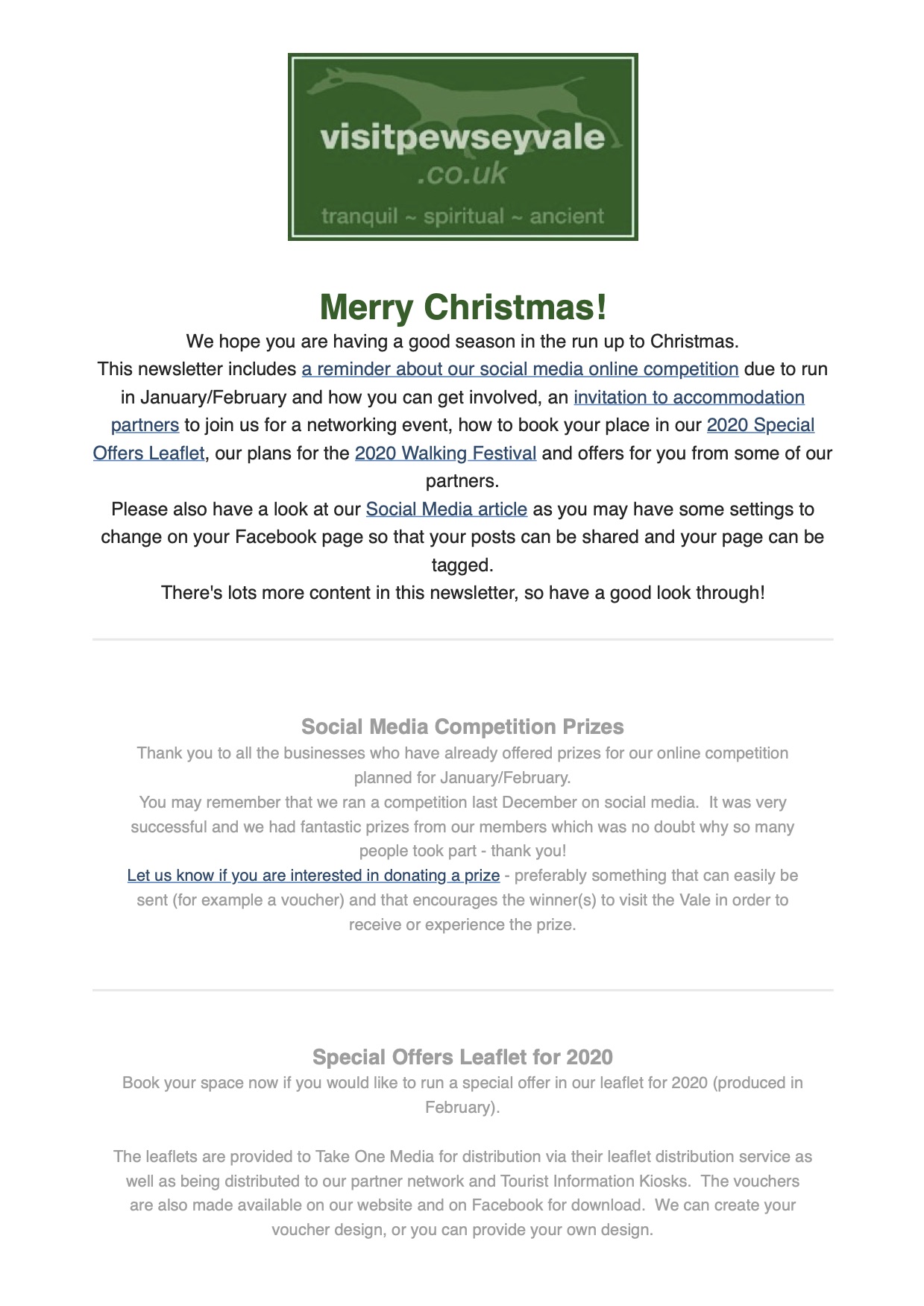 The December 2019 edition of our Business Newsletter includes an invitation to our Accommodation Partners event, request for competition prizes and details of the Special Offer Leaflet for 2020 as well as other news.